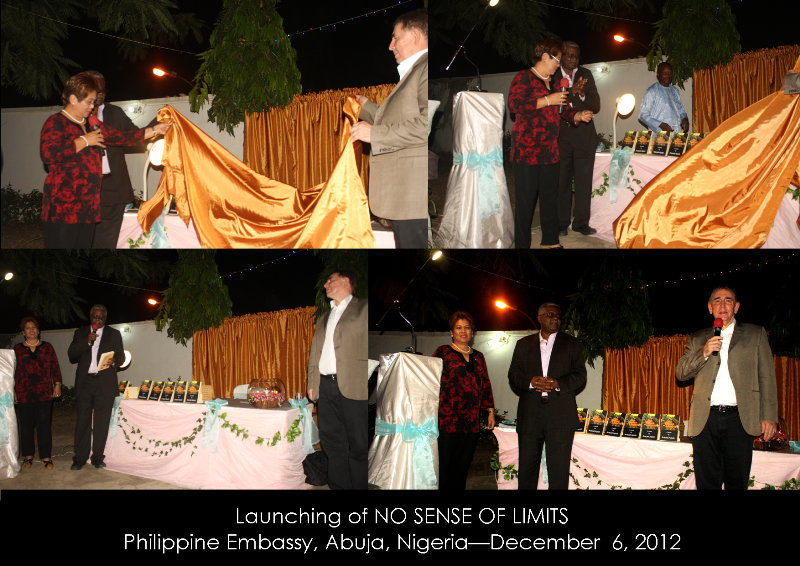Four Chief Executives of companies operating in Nigeria – Mr. Les Blair (from Scotland) Dr. Lovett Lawson (from Nigeria), Mrs. Wilma Nakhai (from the Philippines) and Mrs. Lolita Victorio (from the Philippines) – generously made cash donations at the launching of my novel No Sense of Limits at the Embassy of the Republic of the Philippines, Abuja, on 8th December 2012. Mr. Blair, Dr. Lawson, and Mrs. Victorio donated N250,000.00 each while Mrs. Nakhai donated N20,000.00. Donations from other supporters bring the total amount raised at the launching to more than a million naira, part of which will be donated to charity.